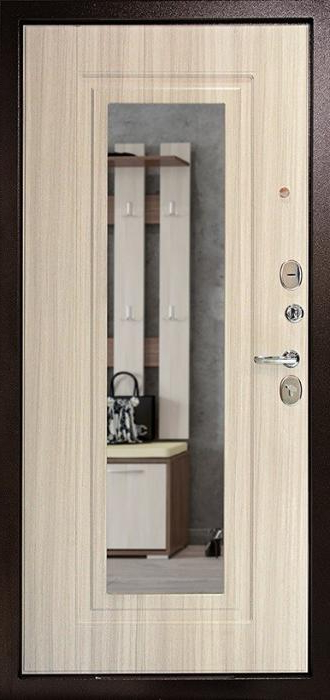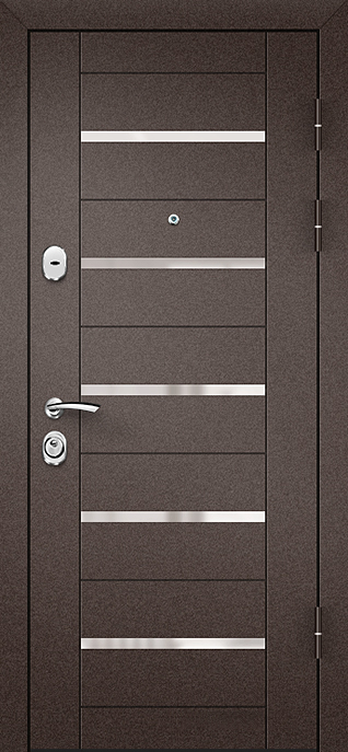 Прочный стальной каркас, лист металла толщиной 2 мм и система блокираторов делают эту модель надежным барьером для квартиры, офиса или частного дома. Внешняя поверхность покрыта молотковым напылением, устойчивым к механическим повреждениям и перепадам температуры, благодаря чему дверь сохраняет аккуратный вид долгие годы. Внутренняя накладка МДФ добавляет уюта и гармонично сочетается с интерьером прихожей. Зеркало на полотне выполняет не только декоративную функцию, но и делает пространство визуально шире. Зеленая входная дверь в квартиру №2 комплектуется двумя замками российских производителей — сувальдным Просам и цилиндровым Мосрентген, каждый из которых оснащён тремя ригелями. Два контура резинового уплотнения помогают минимизировать сквозняки и шум, а возможность выбрать сторону и тип открывания делает установку максимально удобной. При необходимости отделку, замки и дополнительные элементы можно адаптировать под индивидуальные требования. Зеленая входная дверь в квартиру №2 от производителя: быстрое изготовление и монтаж в Белозерском, индивидуальные размеры, широкий выбор материалов и фурнитуры, официальная гарантия до 10 лет.