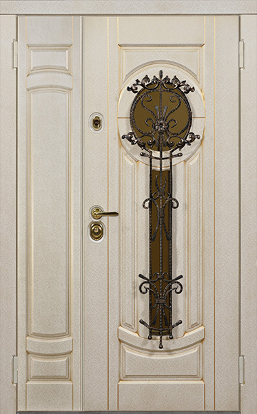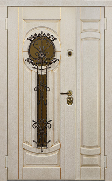 Двухстворчатая парадная дверь с ковкой и стеклом белая №30 — это сочетание красоты и надёжности. Конструкция из профильной трубы 50х25 мм и металлического листа толщиной 2 мм обеспечивает долговечность и стойкость к внешним воздействиям. Элементы ковки придают двери изысканный вид, а стеклопакет позволяет создать атмосферу лёгкости и прозрачности. Внешняя и внутренняя отделка выполнены из плиты МДФ, что делает дверь не только привлекательной, но и устойчивой к механическим повреждениям. Для дополнительной герметичности используются уплотнители с двумя контурами, а блокираторы обеспечат безопасность. Вариативность размеров и возможность добавления дополнительных опций, таких как шумо- и теплоизоляция, делают эту модель универсальной для установки в любом интерьере. Двухстворчатая парадная дверь с ковкой и стеклом белая №30 от производителя: быстрое изготовление и монтаж в Белозерском, индивидуальные размеры, широкий выбор материалов и фурнитуры, официальная гарантия до 10 лет.
