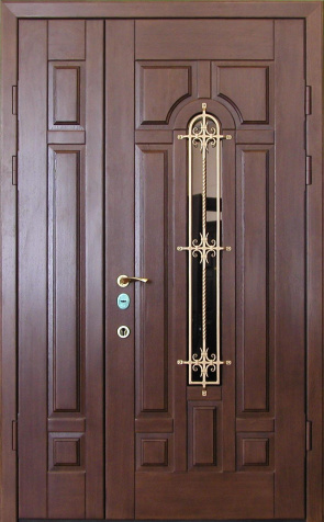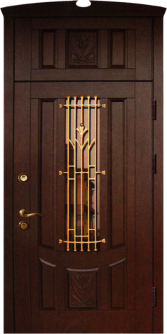 Дизайнерская входная дверь в частный дом с отделкой под дерево и решеткой №17